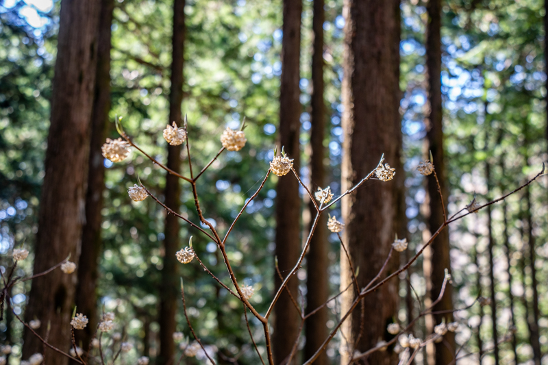 ときおり薄暗い植林の影にミツマタが残っていたり