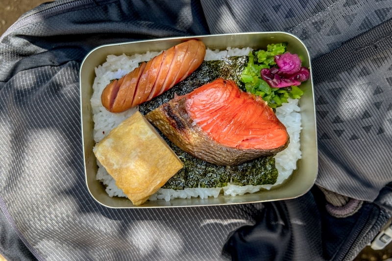 ひとしきり展望を楽しむと、今日はじめて腰をおろして休憩そして深夜に自分でこさえたお弁当でランチ