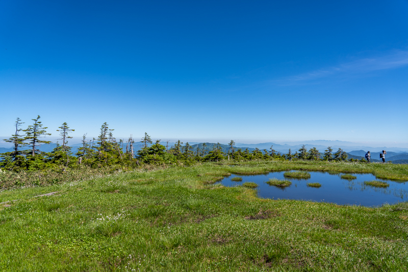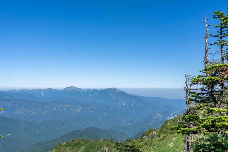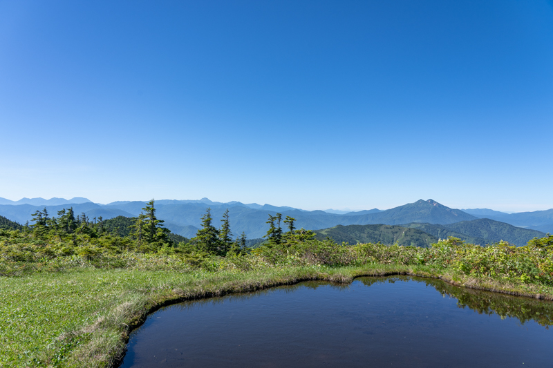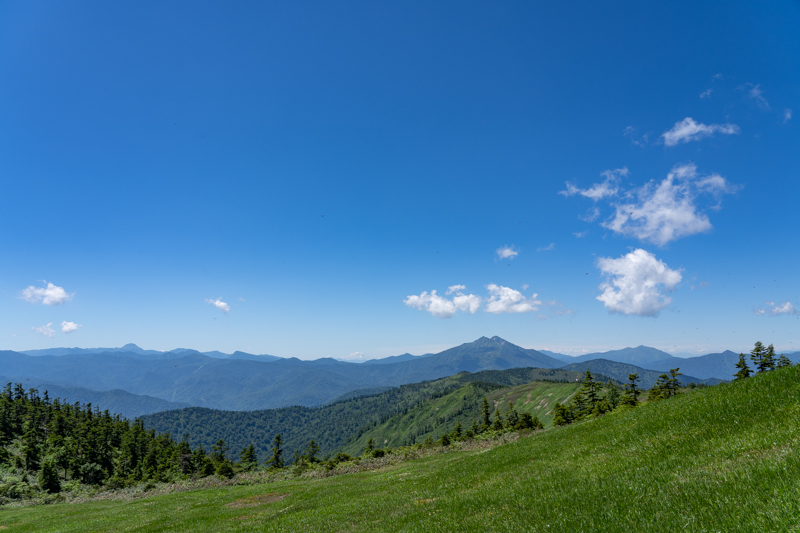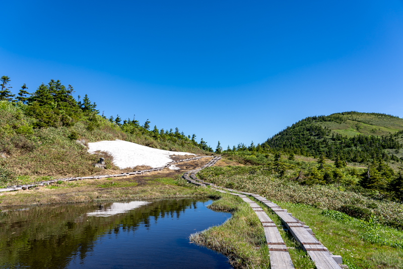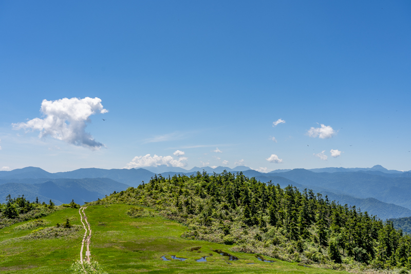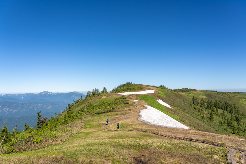 駒ヶ岳ピークへの木道を回り込むと越後三山がくっきりと