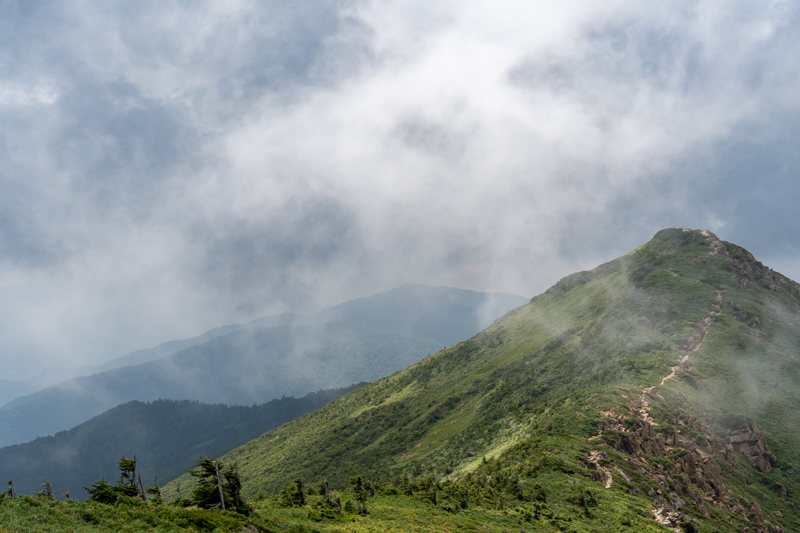 早朝からのガスも抜けず、曇天の様子にうなだれて登り詰める