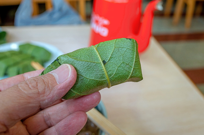 そのお店の中では、古めかしい塗りの箱に並ばれた柿の葉を