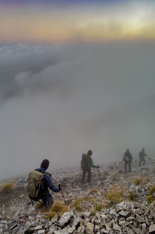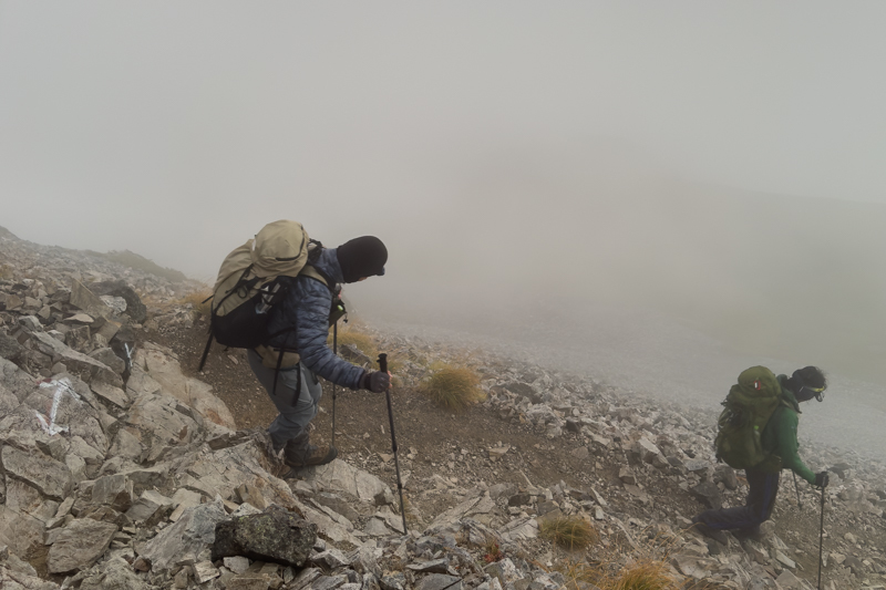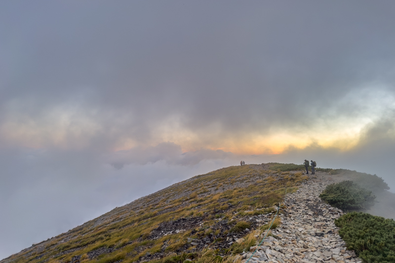 岩稜地帯を下る頃、やっと空が明るくなるが、霧雨は続く