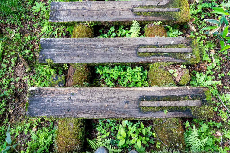 しばらくは沢沿いに進むと、石の階段から木道へと変わり