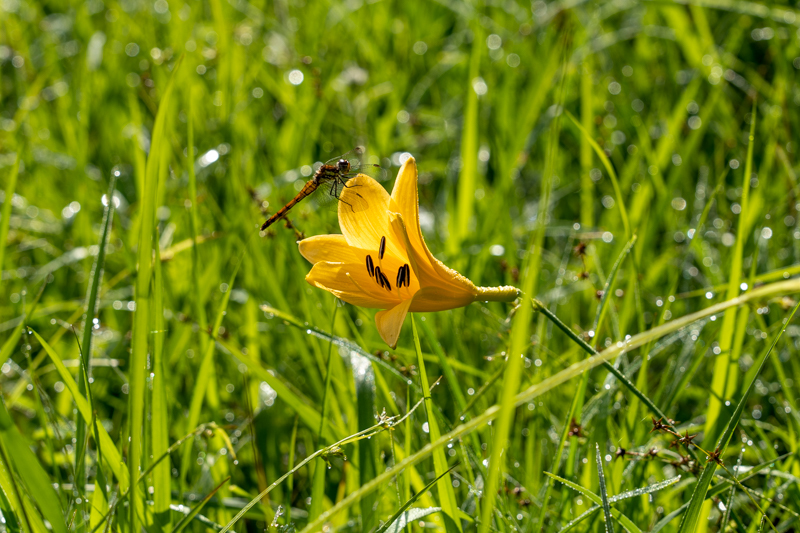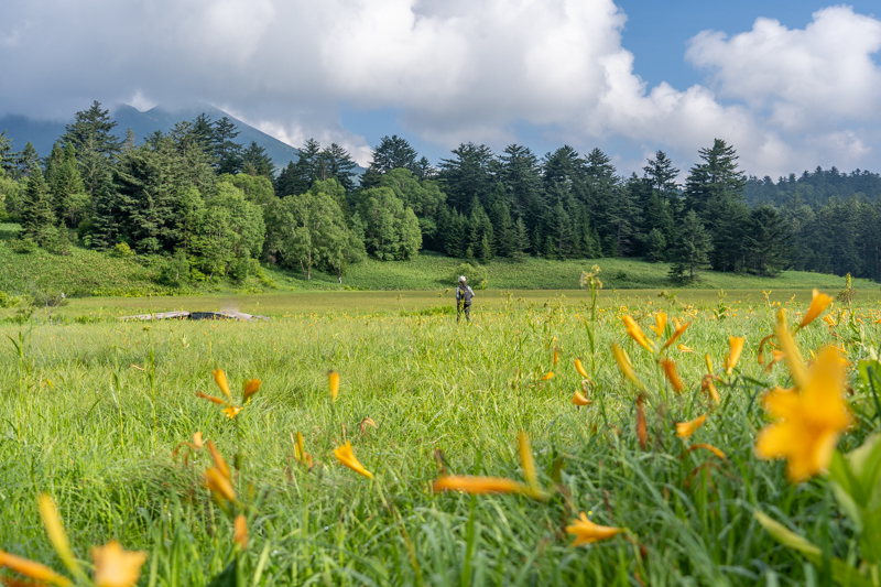 大江湿原は、夏空に気の早い雲が湧き始め、キスゲが朝露に輝き