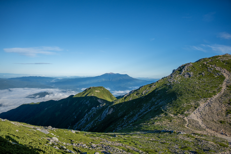もう既に雲海が広がる姿を背に中岳へと岩場を急ぎながら