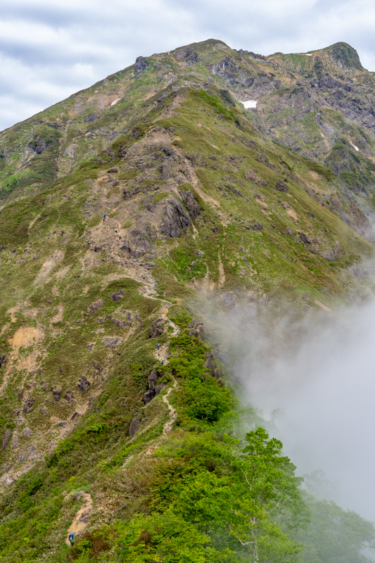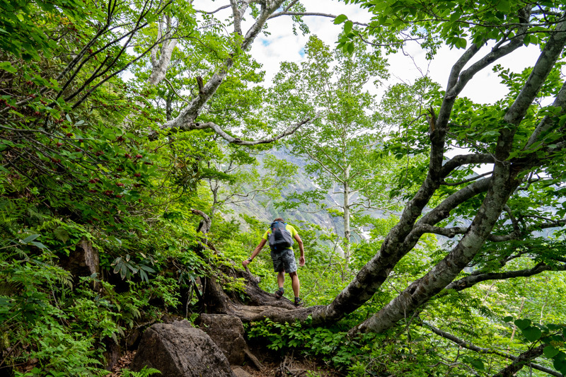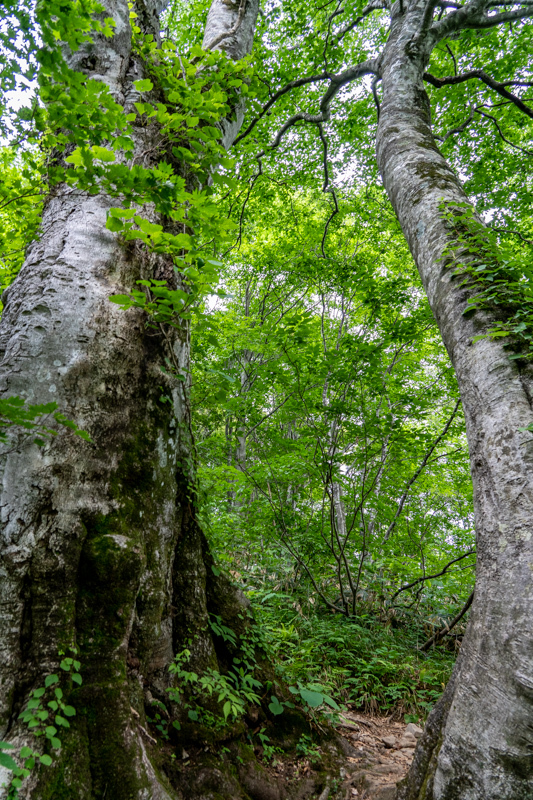 日本三大急登のひとつとされる尾根は、ブナ樹林を縫うように進む