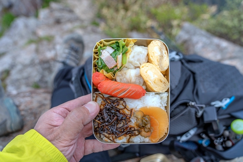 お弁当写真の次の次、尖がり坊主の「大源太山」が写ってますね。