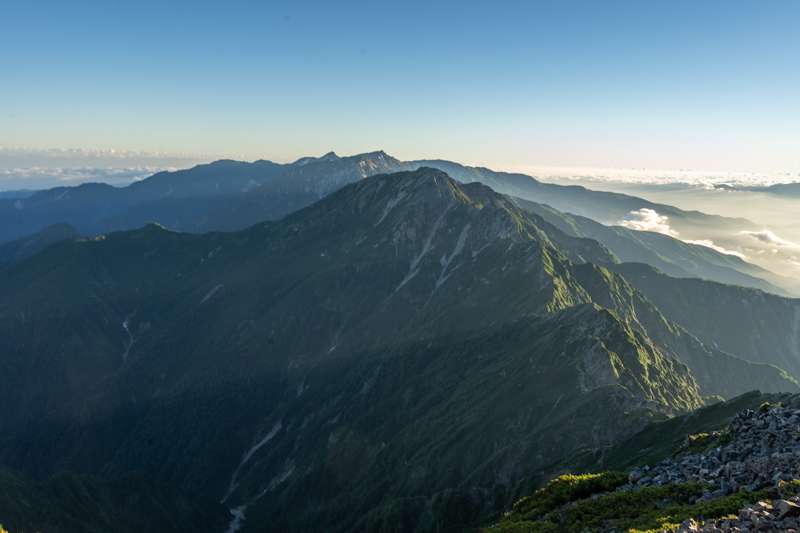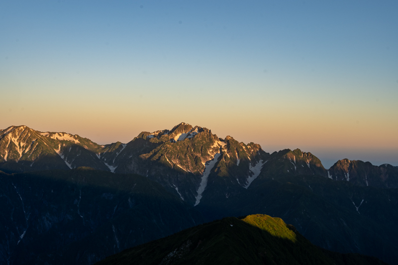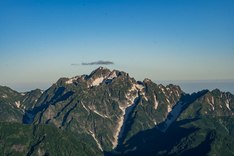 西の剱岳には、これから向かう鹿島槍ヶ岳の影が伸る