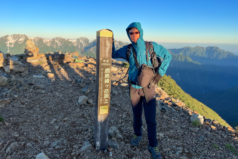 山頂直下の岩場を超えて鹿島槍ヶ岳に立つ
