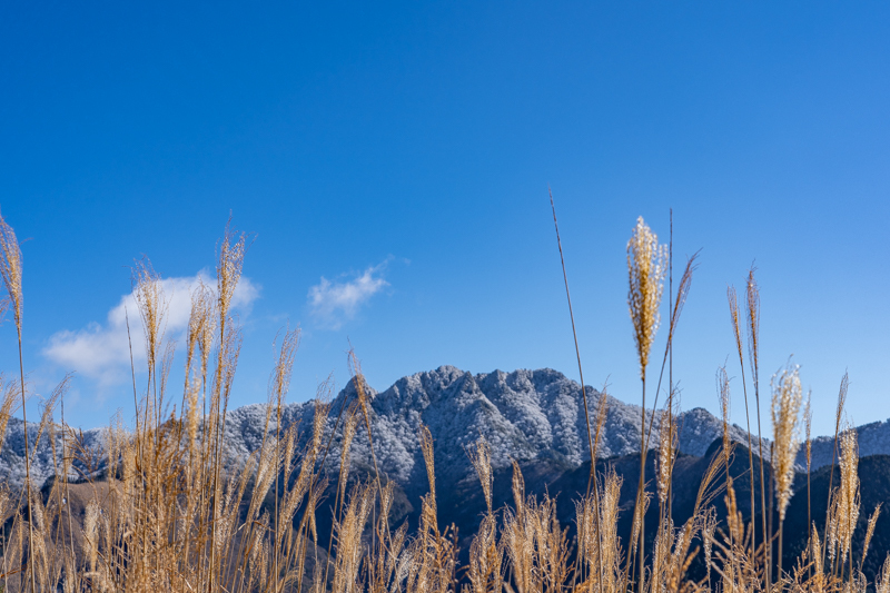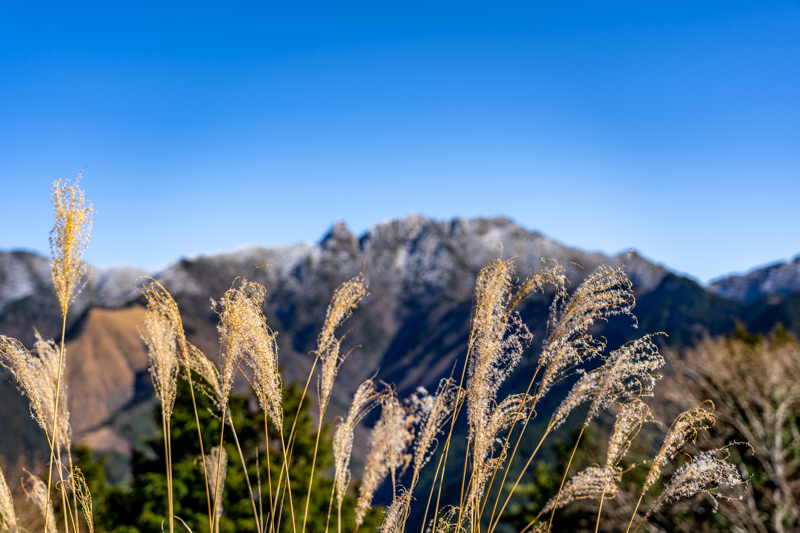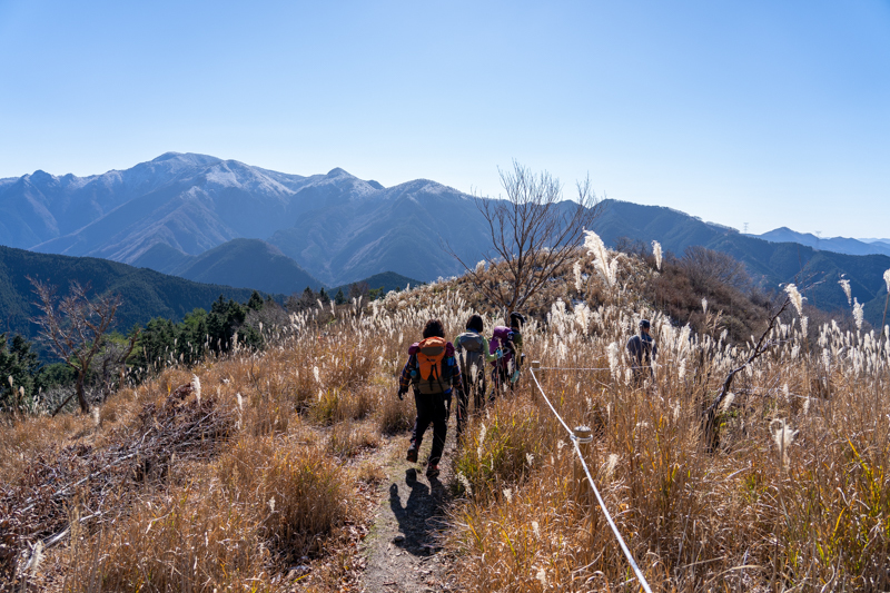 ススキの中、もう冬支度している大峰の姿をふり返り、ふり返り