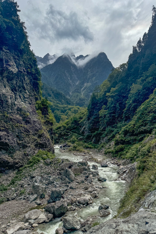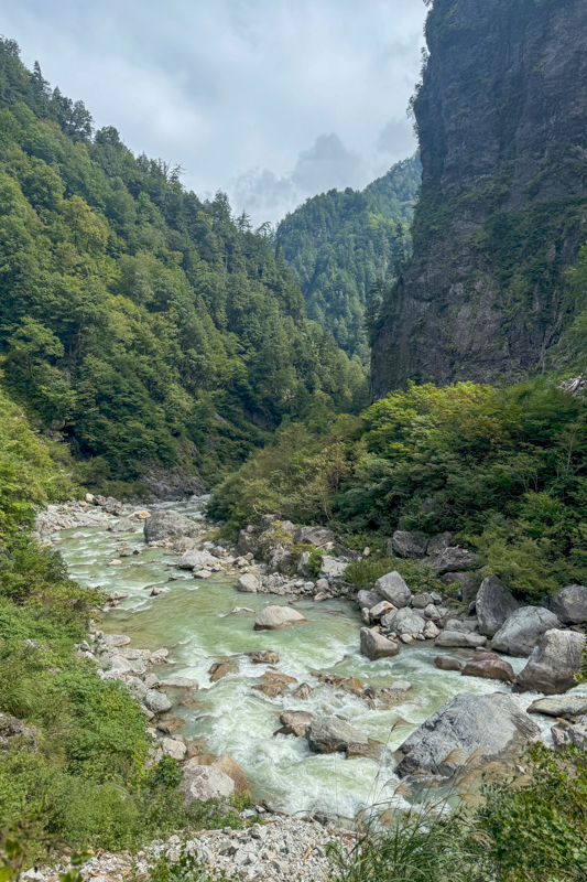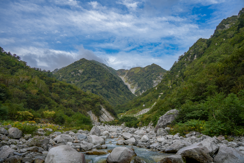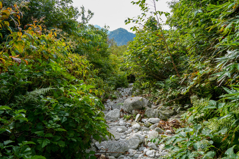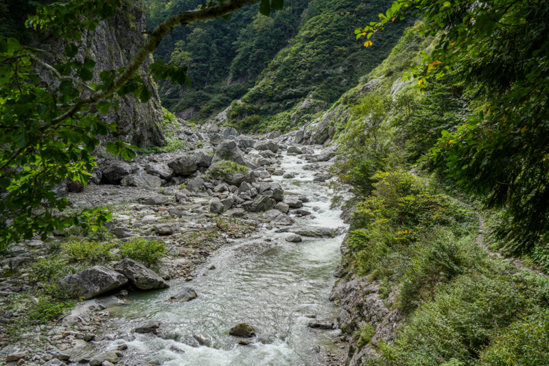 内蔵助谷へと下りきりると、黒部川沿いのアップダウンを繰り返しながらダムへと戻るルート