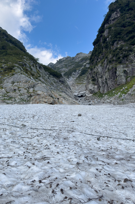 雪渓はいつ崩れるか分からないような状態だ