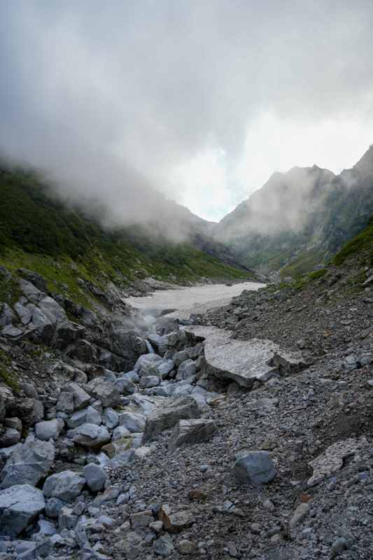 その激しさとは逆に、雪渓の下には、静かに時を語っているような沢の音