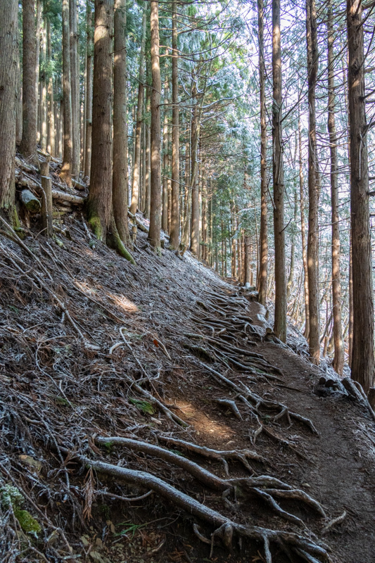 カラマツの林に挟まれて、そこだけ登山道の幅が狭くなる登り