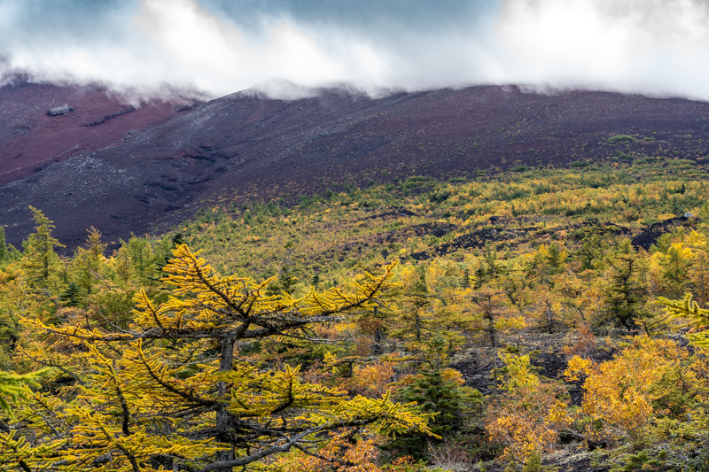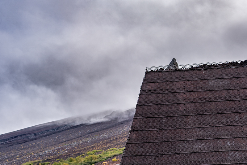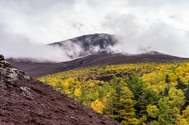 上空からは雲が降り、裾野からはガスが沸き上がり