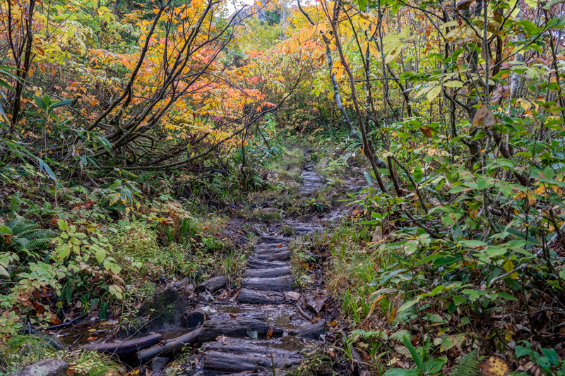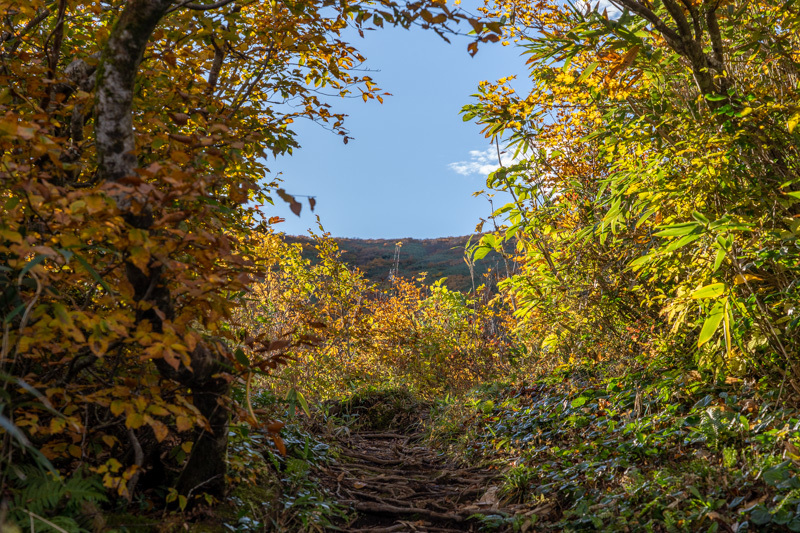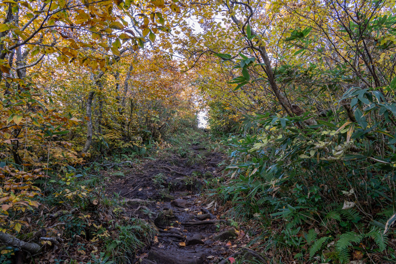 やや勾配が楽になったころ、トレイルは黄葉に染まった