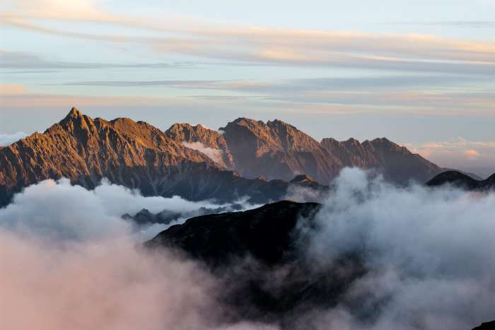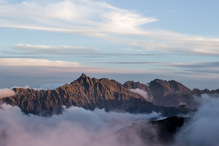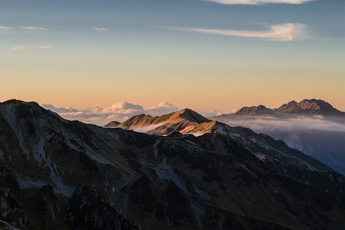 野口五郎から朝陽が射す、今日も秋晴れ、北アルプス