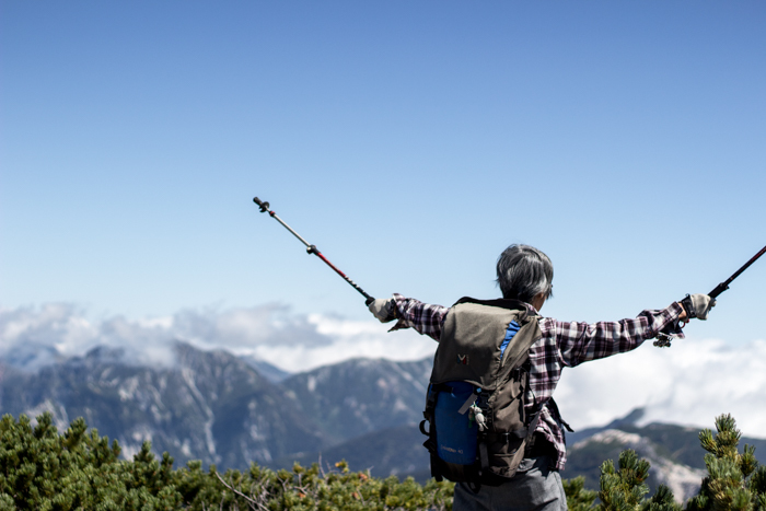 女性はピークを踏むと、声も無くバンザイし、稜線の東端へ小走りで進むと