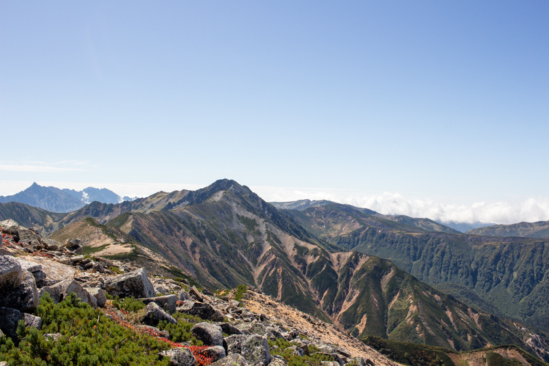 右手に黒部五郎から薬師、ふり返ると五色ヶ原から立山