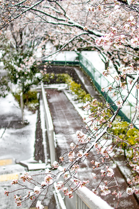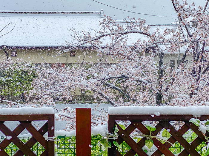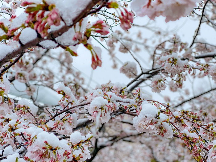 季節外れの雪、せっかく満開の桜も雪に凍り付き
