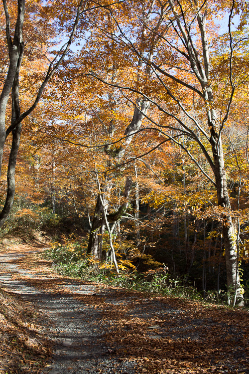 林道は、広い高原地となり、ダケカンバの白い樹が紅葉に映える