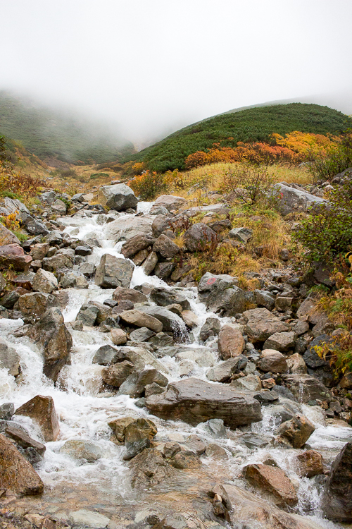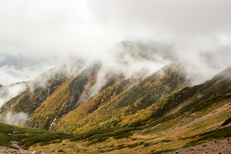 その紅葉の光景に、もう北アルプスは一足早く、晩秋を迎えていることを知る