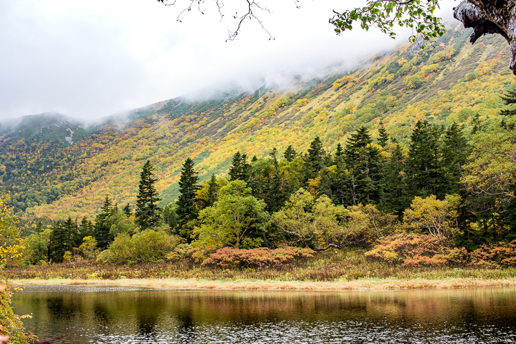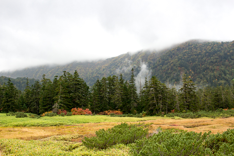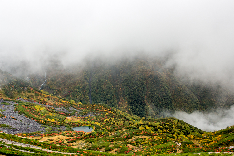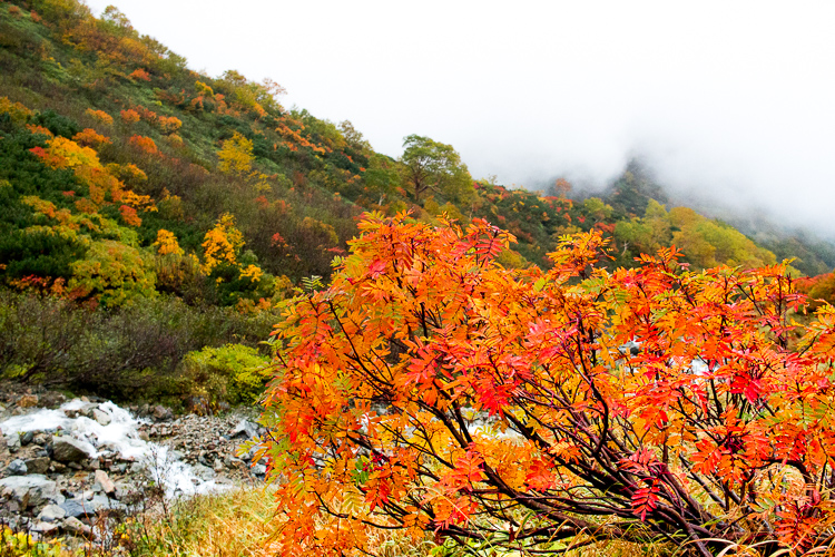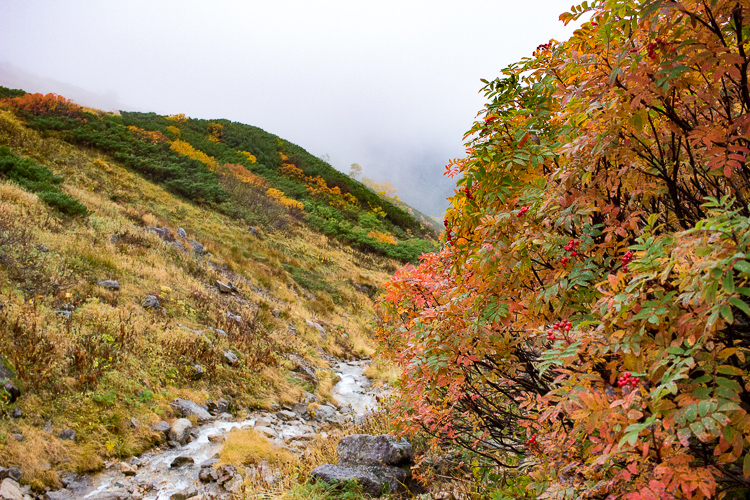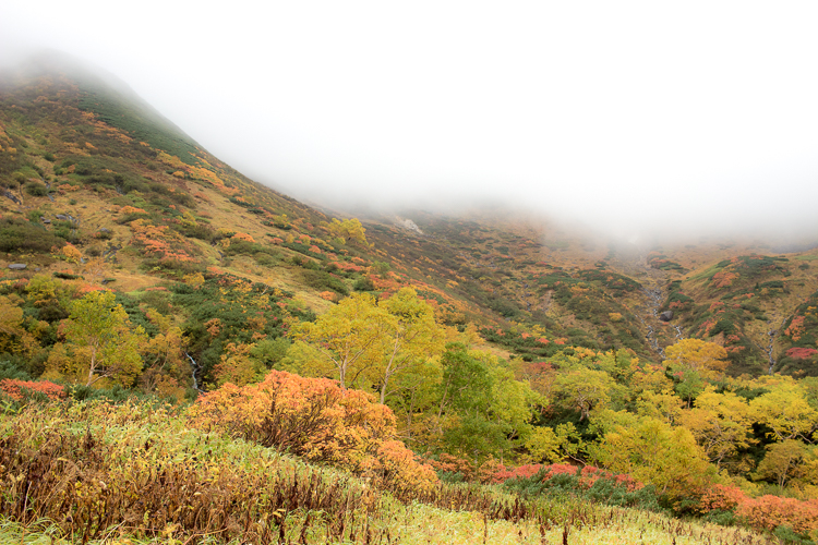 ガスも晴れ始め、紅葉の色がどんどん鮮やかとなる
