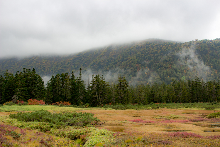 湿原の向こう、流れるガスの中から覗くのは薬師の稜線