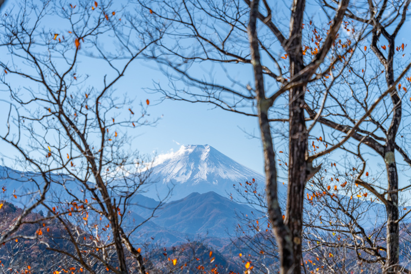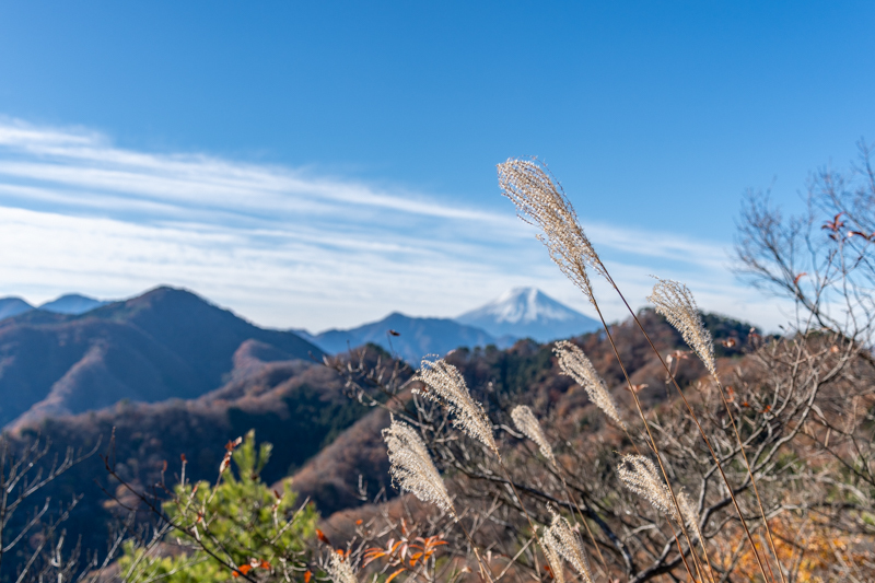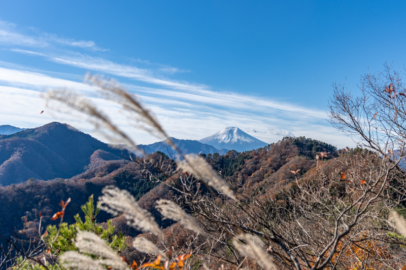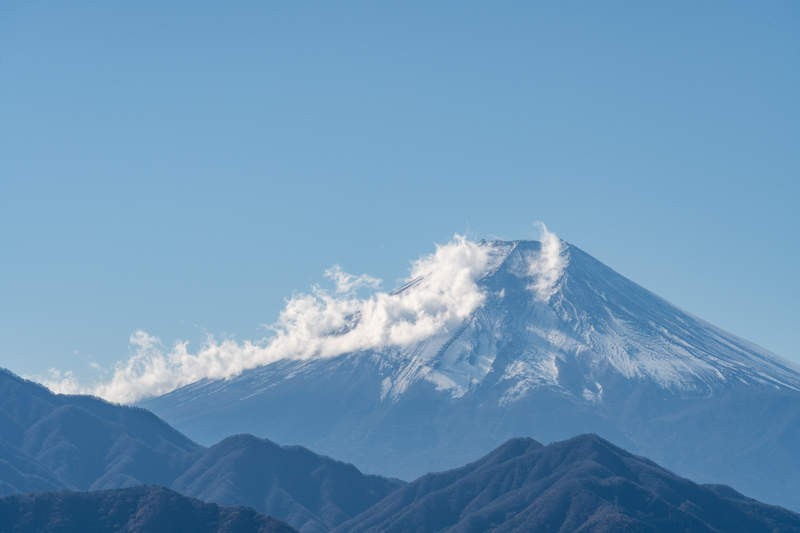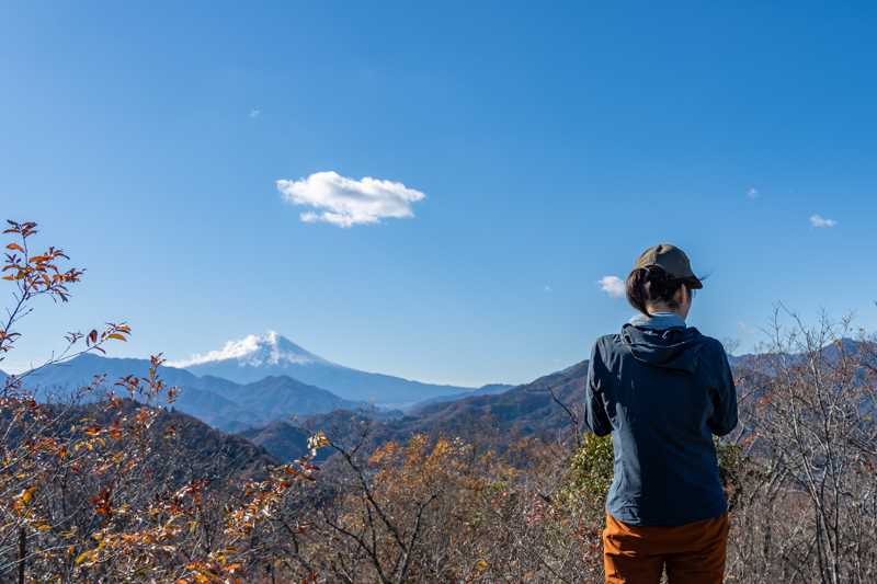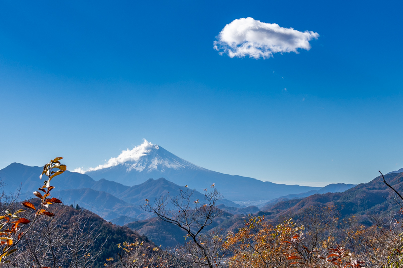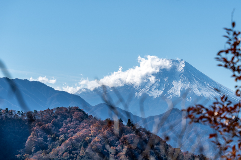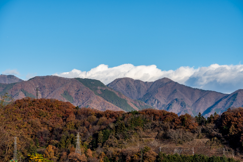 すぐに北側に百蔵山、扇山の稜線に雲がかかる美しい風景に立ち止まる