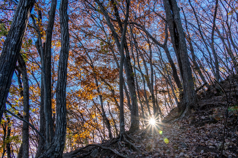 やっと尾根から陽が出始めたのは8時30分頃、その朝陽が落ち葉のトレイルを輝かせてくれる