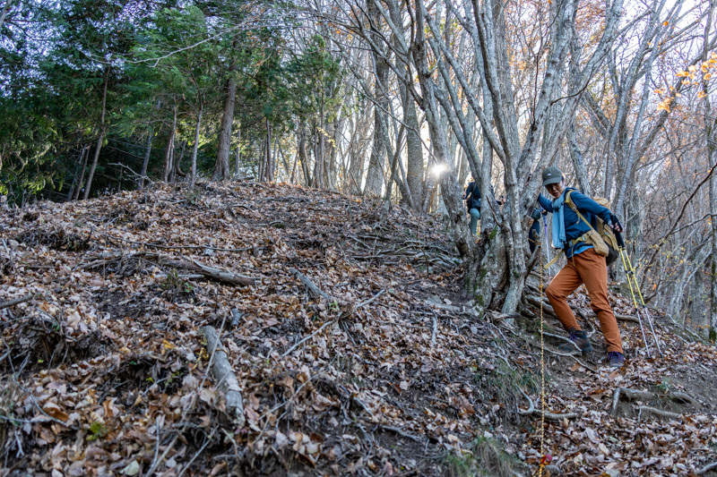 しかし重なった落葉の下は岩稜で、つるつると滑りながらの登りに苦労する