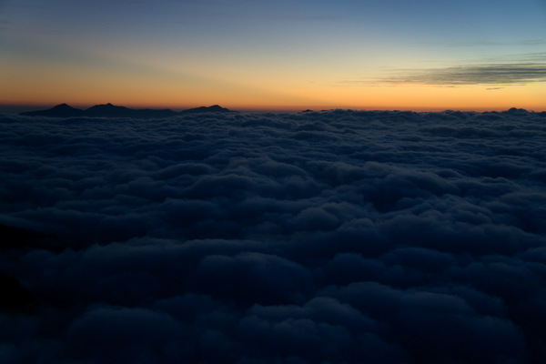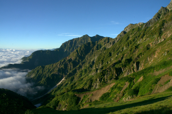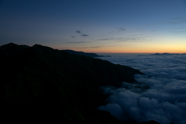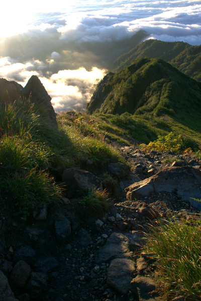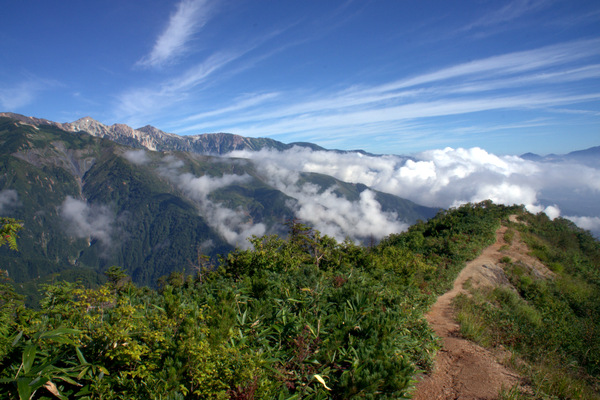 尾根を下りながらも、視線はずっと南の方向、雲海の残りと五竜、そして鹿島槍