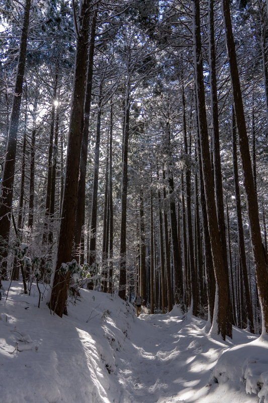 薄暗いトレイルに木漏れ日が雪を照らす