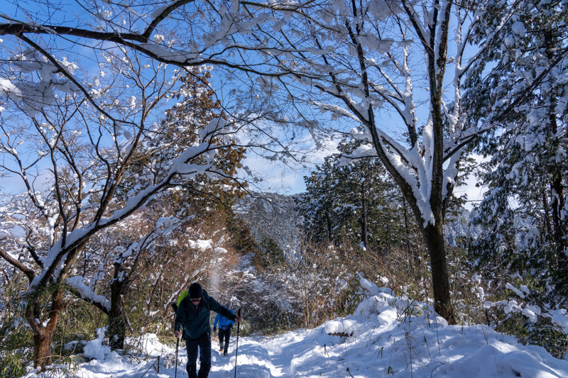 登山口からすでに雪景色、スパイクいつ着けようか?