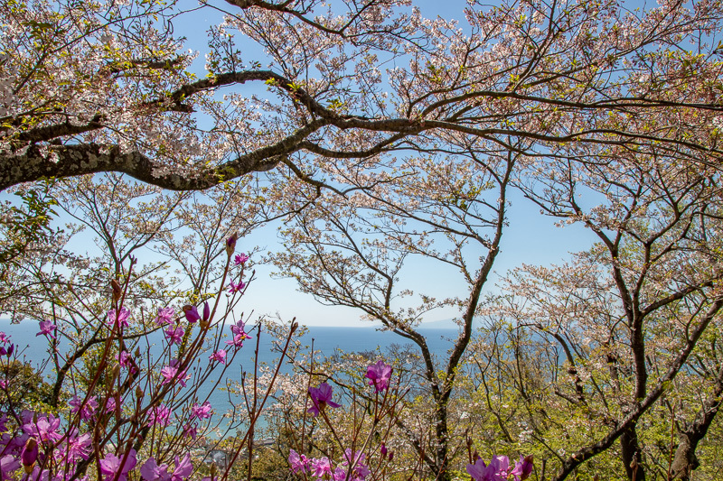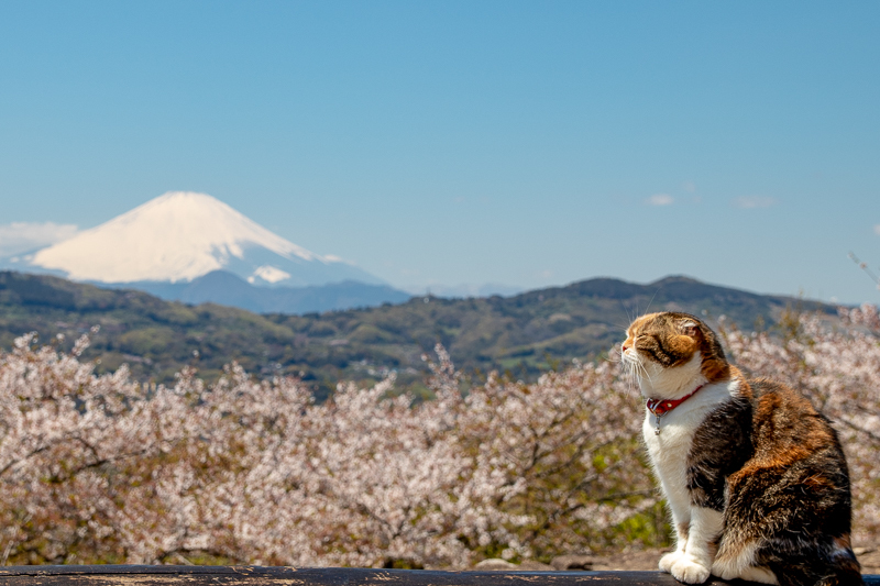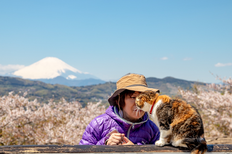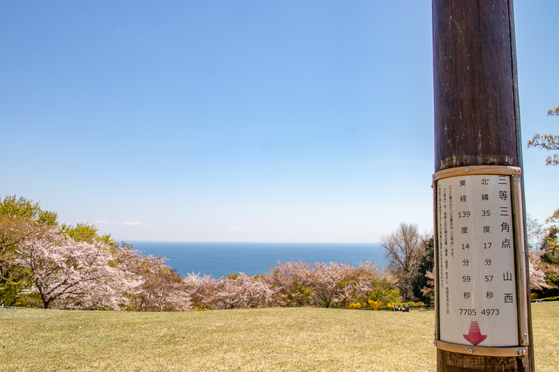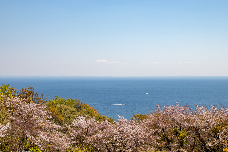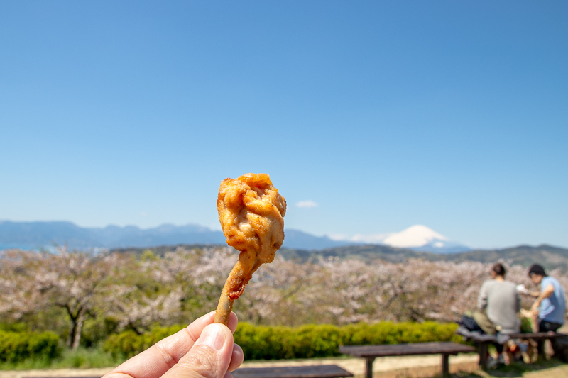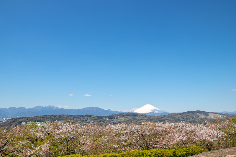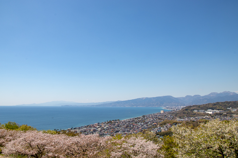 富士山を眺めながら桜の下、眼下には相模湾が春の陽に輝く