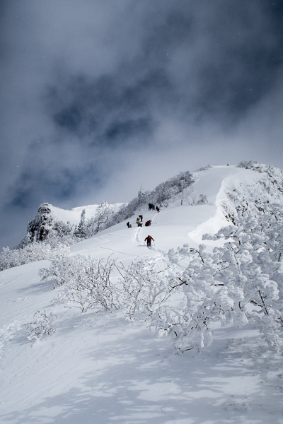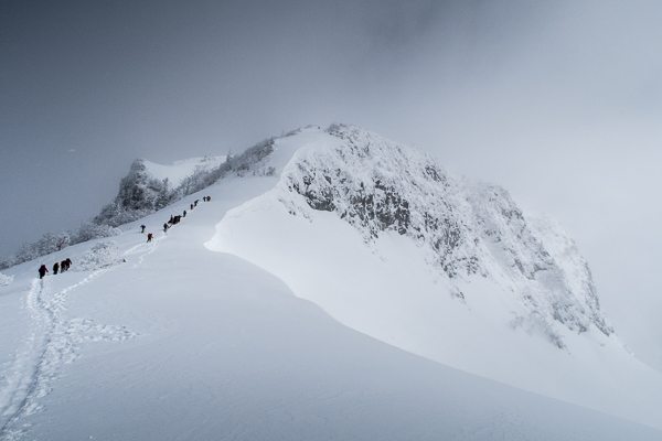 下山する頃には、ギザギザ稜線の上に、厚い雪雲が流れては消え