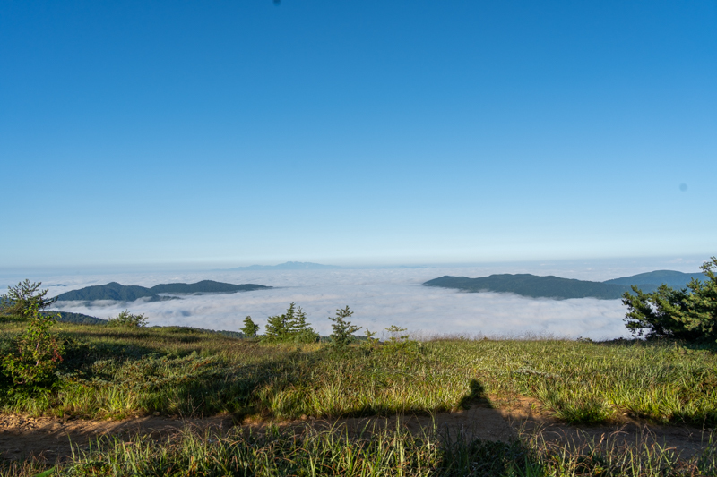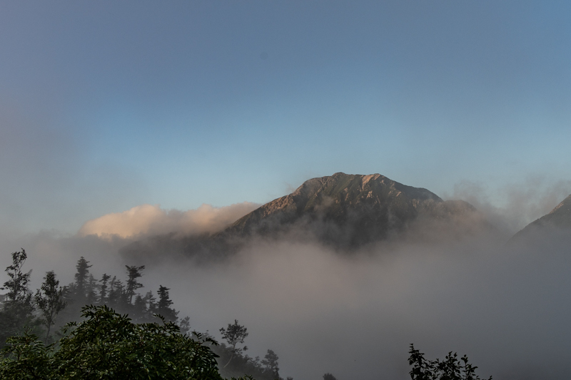 三角点では雲海が流れ始めたところに、薄っすらと浮く剱岳