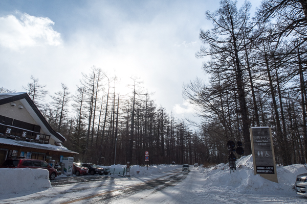 凍結路面を走って赤沼茶屋へ着くと、最後の一台分スペースに滑り込む