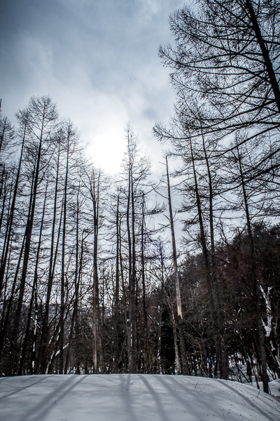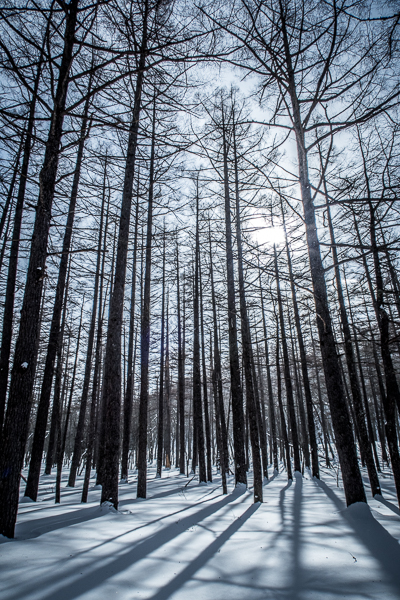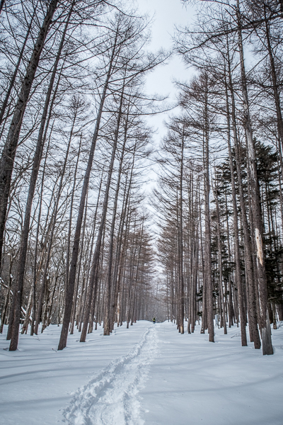 背の高いカラマツの間、ときおり小雪が舞うトレースを黙々と追う