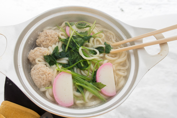 吹雪の中、もうもうと湯気を上げて頂くうどんは美味しくて