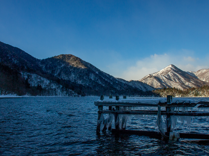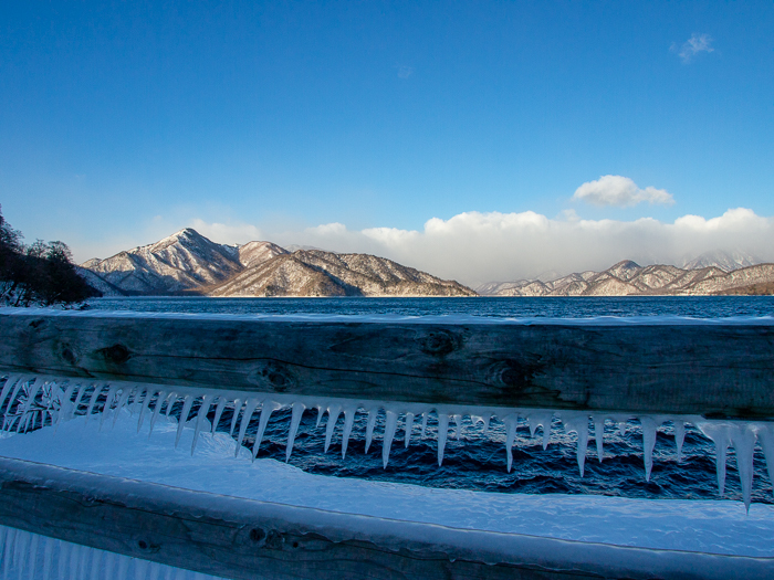 中禅寺湖から湖畔を駐車場へ進むと、路肩は雪が積もり、ところどころ凍結