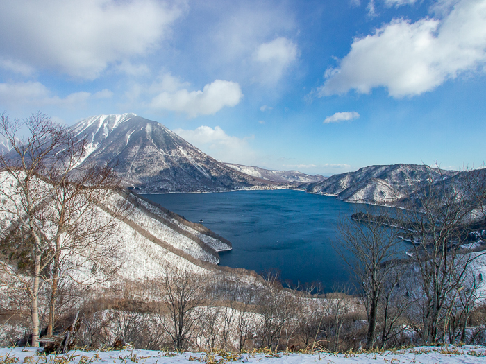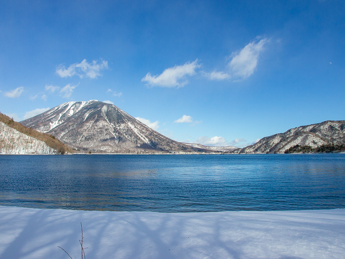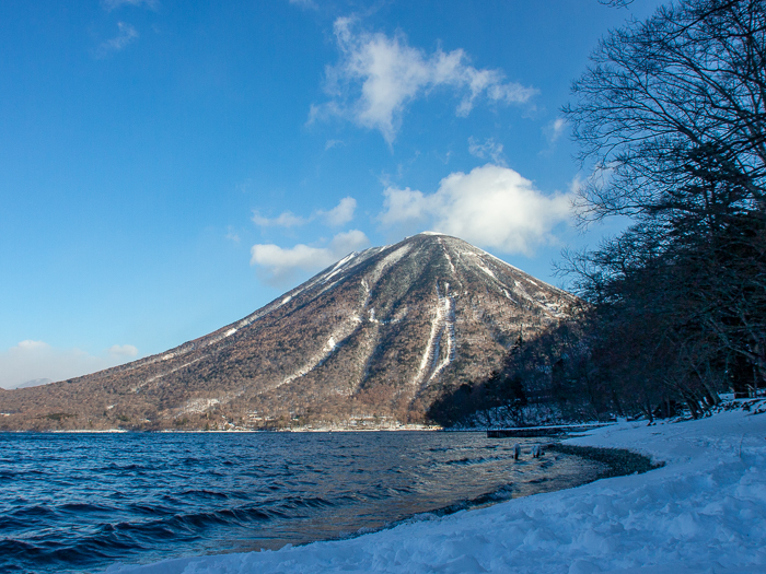 男性を残し先を行くと、大きな湾からの男体山が美しい