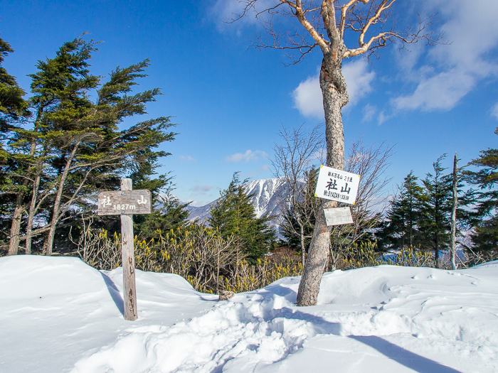 長い雪庇の尾根を登り詰めると、そこだけ樹林となったところがピーク
