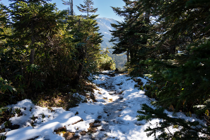 足元の濡れ具合は気になるが、この晴天に冠雪の薬師だ