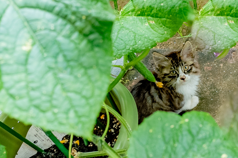 キュウリのプランターの影で小さくなってた娘っ子が