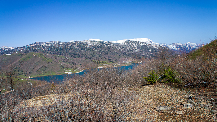 野反湖畔からの登山口は尾根伝い、歩き始めてすぐに振り返ると、すぐに草津白根が輝く