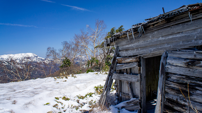 狭い山頂には山名板、そして今にも崩れ落ちそうな避難小屋・・・