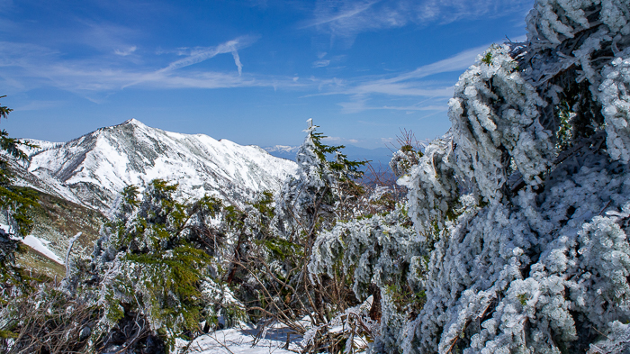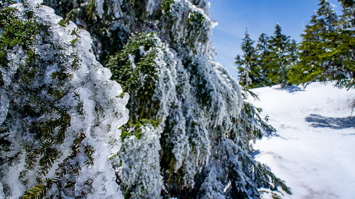 トレイルは樹林帯に入り込む、いつの間にか融け始めた霧氷に囲まれていた