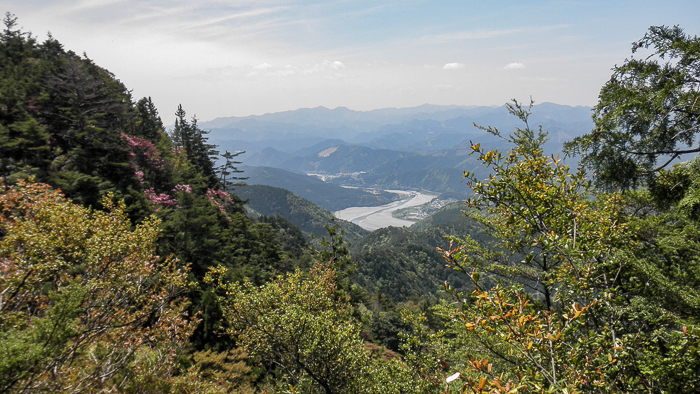 最後の七越峠を登りきると汗びっしょり、もう熊野川は足元に広がる
