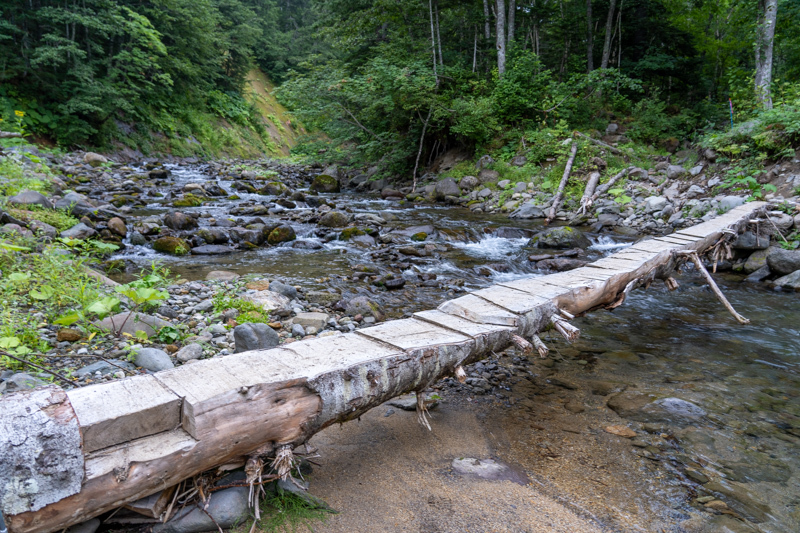 登山口からすぐに深い森、そして渡渉石狩川源流の一部でもあるクチャンベツ川の流れる音がまだ暗い森に響く